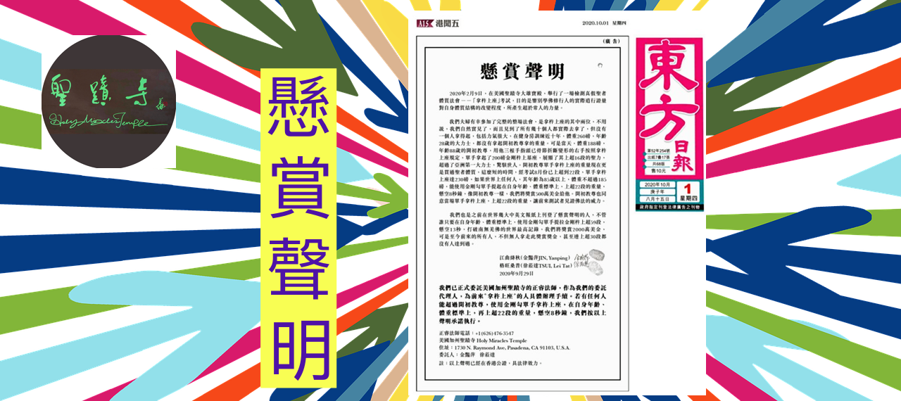 金艷萍、徐蒞達夫婦二人親自參加了在聖蹟寺舉行的「拿杵上座」的考試,他們已經在香港、台灣等地刊登懸賞聲明,如果世界上任何人,其年齡為85歲以上,體重不超過185磅,能使用金剛勾單手提起在自身年齡、體重標準上,上超二十二段的重量,像年齡88歲、體重180磅的開初教尊一樣,將獎賞500萬美金給他。因此,一、只要你劉子朋找到這樣的人,來聖蹟寺公開拿杵上座,做到同開初教尊一樣的上超二十二段。二、聖蹟寺現邀請你,請你提起在你自身體重、年齡的基礎上上超二十二段的金剛杵,懸空八秒鐘。這兩點你只要做到其中任何一點,那你不僅將得到500萬美金的獎賞,我們聖蹟寺屆時也將會向全世界宣佈:你劉子朋所說的一切都是正確的。你來聖蹟寺,我們會負擔你的食宿和保護你的安全,無論你提得起或提不起金剛杵,我們都會絕對恭敬對待你,給你旅費和食宿,而且開初教尊會在現場,以喜悅的心情與你對等同上金剛杵,讓你有機會見識到真正的聖體質和聖體力,洗掉你胡說八道妖言惑眾的惡習,從此不再說謊騙人。