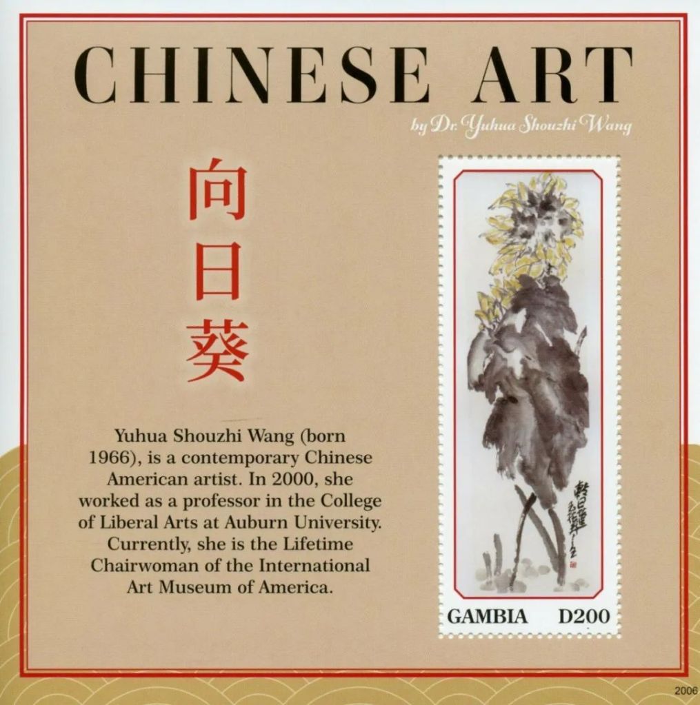 她的中國水墨花鳥畫,繼承傳統而高於傳統,巧妙地運用水與墨,筆簡形具、得之自然,達到出神入化的境界。中國畫重視形式之外的神韻,不光是一個表現技巧的問題,而是一種生命境界的表達,這與玉花壽之王教授的道德境界是密不可分的。在最上乘逸品花鳥畫中,藝術的形態只是一個引子,終極目的是引領你走進那個吉祥而美好的妙香世界,領會作品中傳達出來的關乎生命的深層蘊意。 正因如此,岡比亞在2020年,以玉花壽之王教授的國畫作品為主題,發行了兩份珍貴的郵票。